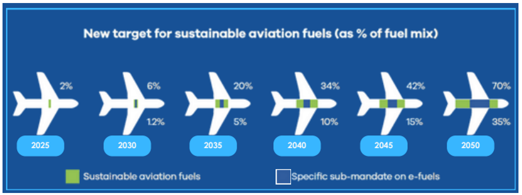 La ReFuelEU Aviation es una normativa que busca asegurar que el transporte aéreo en la Unión Europea cumpla los objetivos climáticos establecidos para 2030 y 2050. A partir de 2025, los proveedores de combustible en aeropuertos de la UE deberán garantizar que el combustible disponible para las aerolíneas contenga un porcentaje mínimo de SAF, y para 2030, se exigirá un porcentaje mínimo de e-SAF. Ambos porcentajes irán aumentando gradualmente hasta 2050: el SAF pasará de un 2 % en 2025 a un 70 % en 2050, mientras que el combustible sintético pasará de un 0,7 % en 2030 al 35 % en 2050. Esto asegurando que el SAF cumpla con los criterios de sostenibilidad y ahorro de emisiones establecidos en la Directiva sobre Energías Renovables. Los combustibles incluidos en la normativa son:
