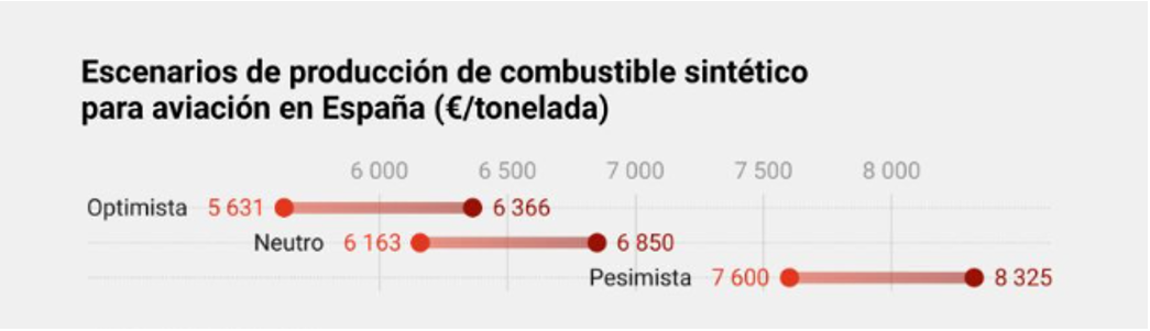 A partir de estas variables, el coste nivelado del e-queroseno se sitúa en 7,35 $/kg (DAC) y 6,69 $/kg (post-combustión), equivalentes a alrededor de 6.700–7.350 €/t. Estos valores pueden interpretarse comparándolos con la gráfica de escenarios para España, donde el e-SAF oscila entre 5.631 €/t (optimista) y 8.325 €/t (pesimista) según el origen del CO2 y el coste del hidrógeno verde. El escenario post-combustión del TFG cae dentro de la banda neutra, mientras que el escenario DAC se aproxima al rango pesimista, coherente con su mayor demanda energética.